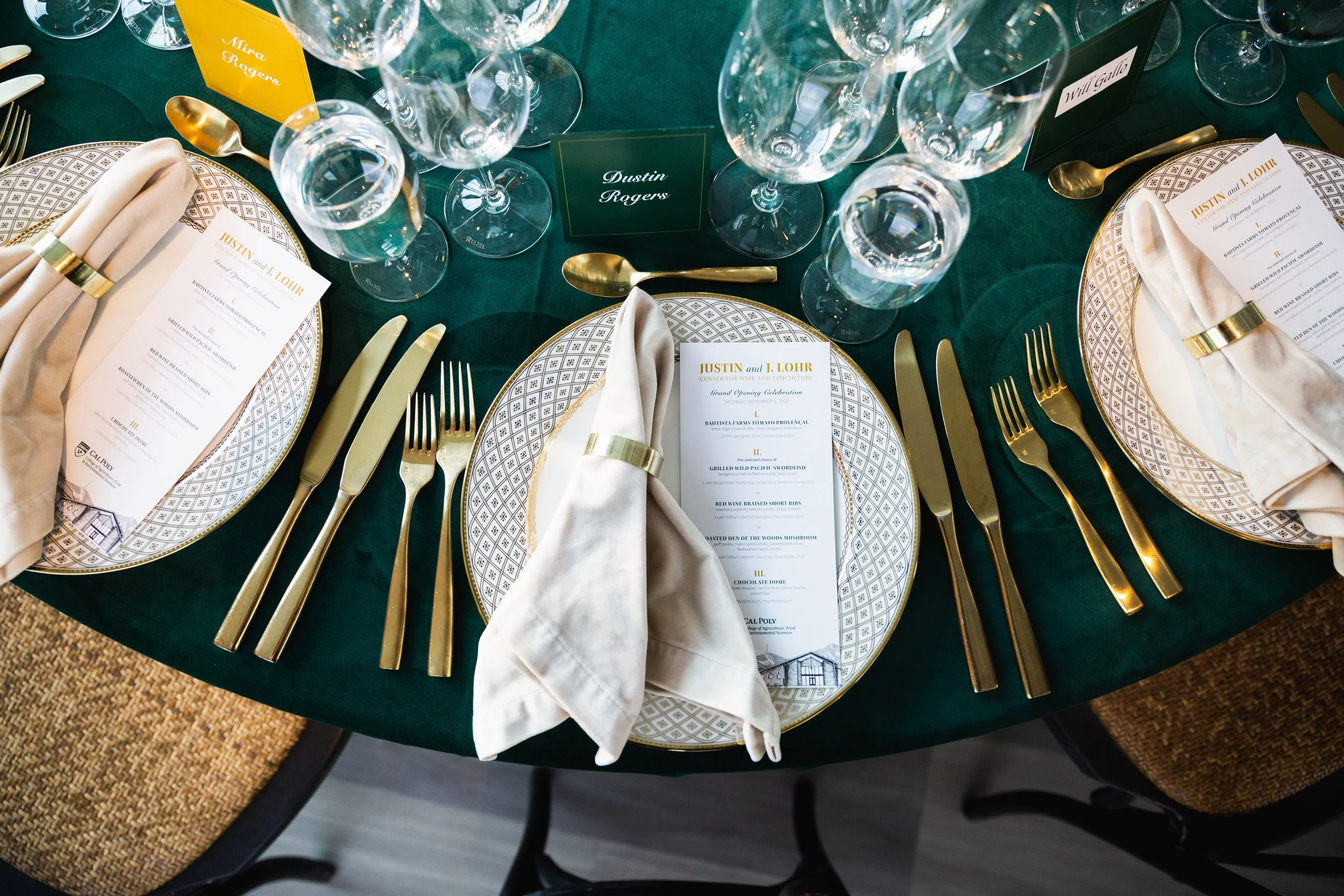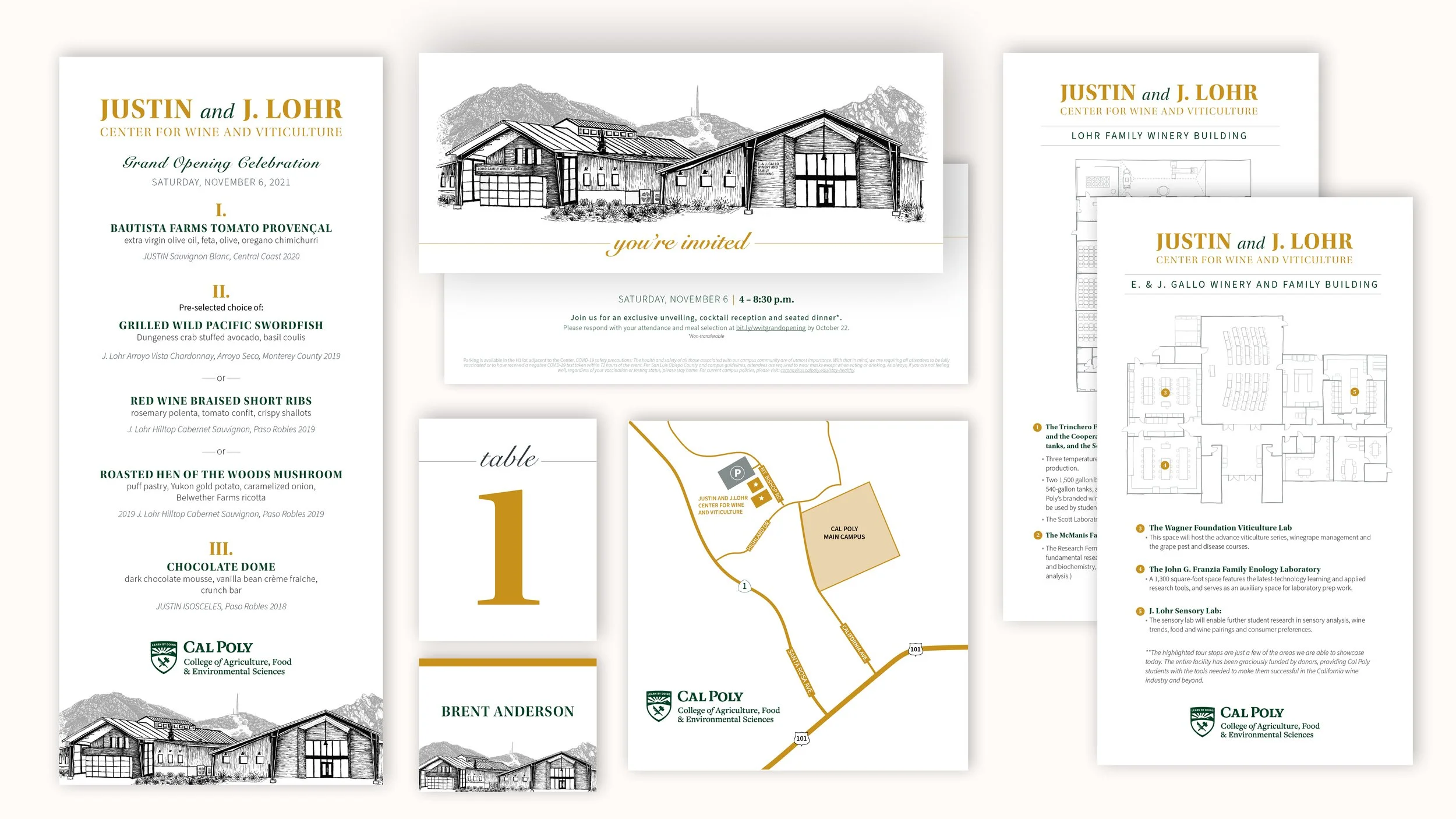 A full event suite for the grand opening of the Cal Poly JUSTIN and J.LOHR Center for Wine and Viticulture. The suite included a save the date, invitation, menu, table settings, and a self-guided tour card for the new facility. The custom illustration of the center was developed for event branding and went on to be printed on tote bags for the parties attendants.