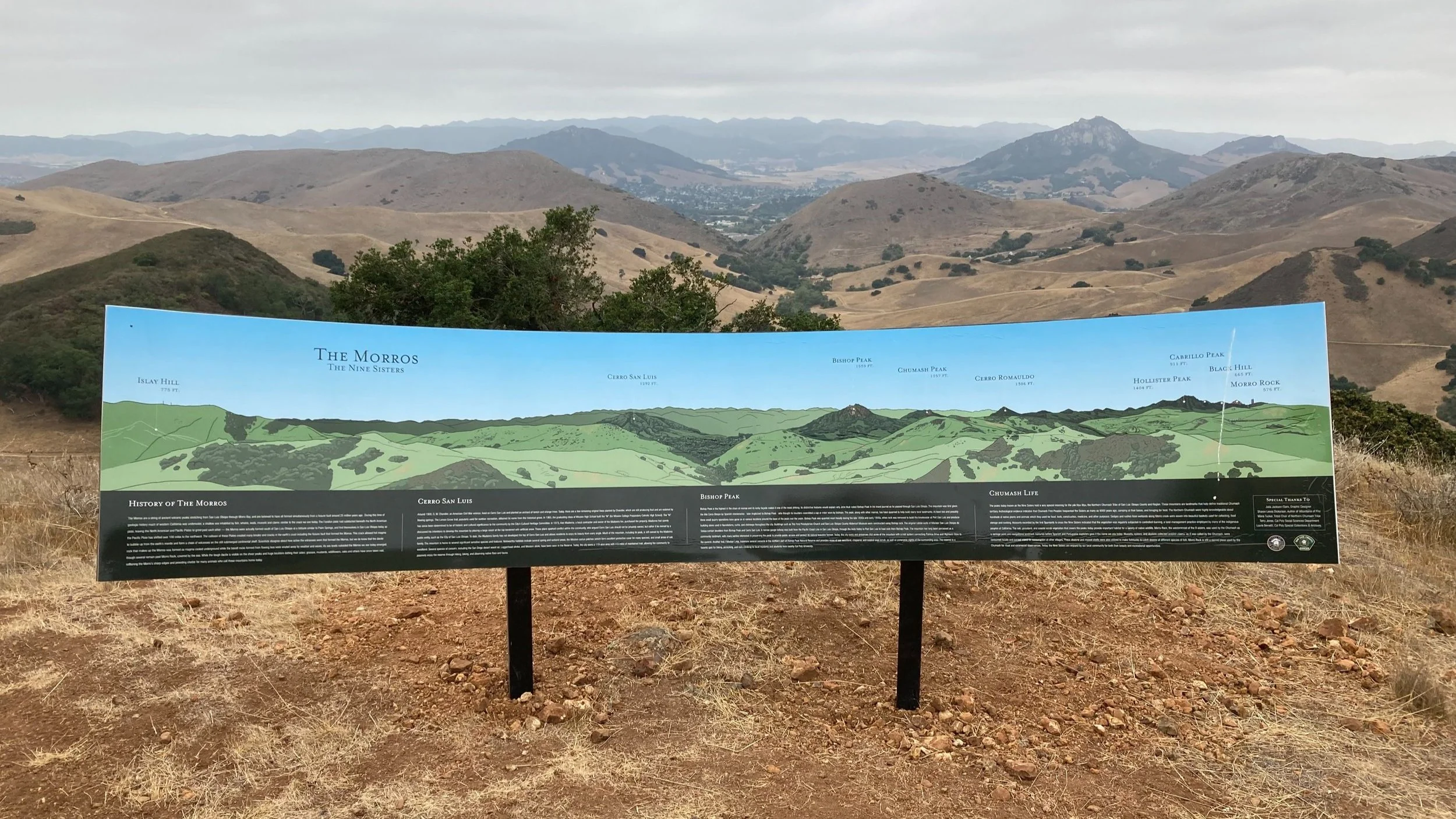 The Panorama Trail is a new trail recently opened by the San Luis Obispo Parks and Recreation Department. The steep and winding climb ends at this trail sign which looks out over The Nine Sisters, a chain of volcanic mountains that carve the landscape of the area.